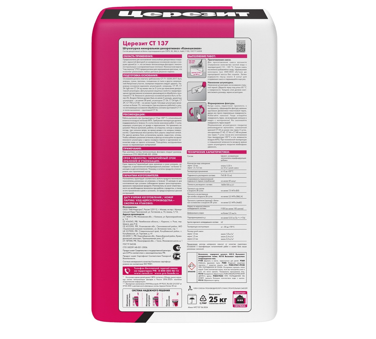 С помощью штукатурной смеси CT 137 изготавливаются декоративные тонкослойные покрытия, имеющие зернистую фактуру. Выпускается вариант белого цвета и версия, предназначенная под покраску, которая позволяет реализовывать любые цветовые решения. Существуют модификации по зернистости – 1,0; 1,5; 2,5 мм. Также имеется зимний вариант смеси для нанесения при температурах ниже 0°C.